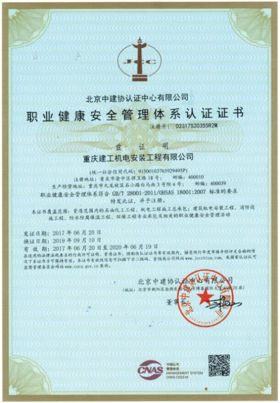 职业健康安全管理体系认证证书正本